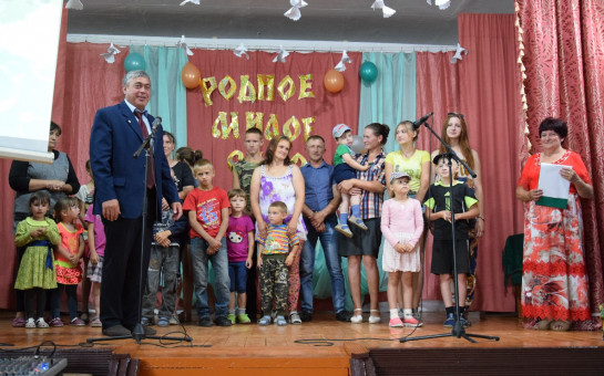 А вот и самый маленький житель села Макар Шиц, ему 3 месяца, на сцене с мамой, папой, братиком и сестрой.